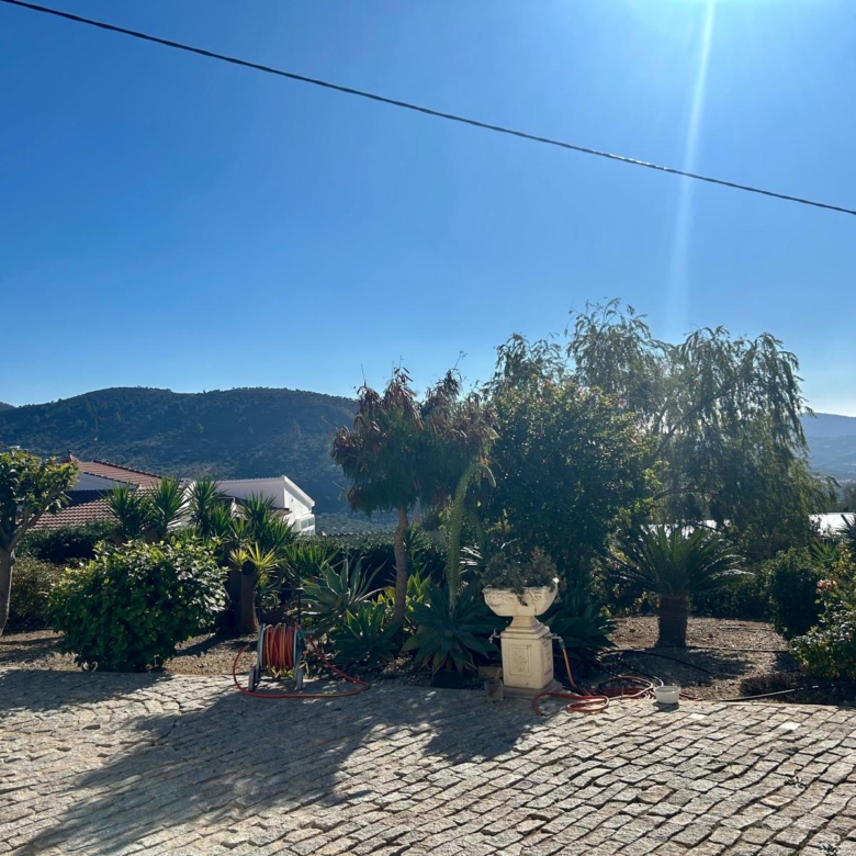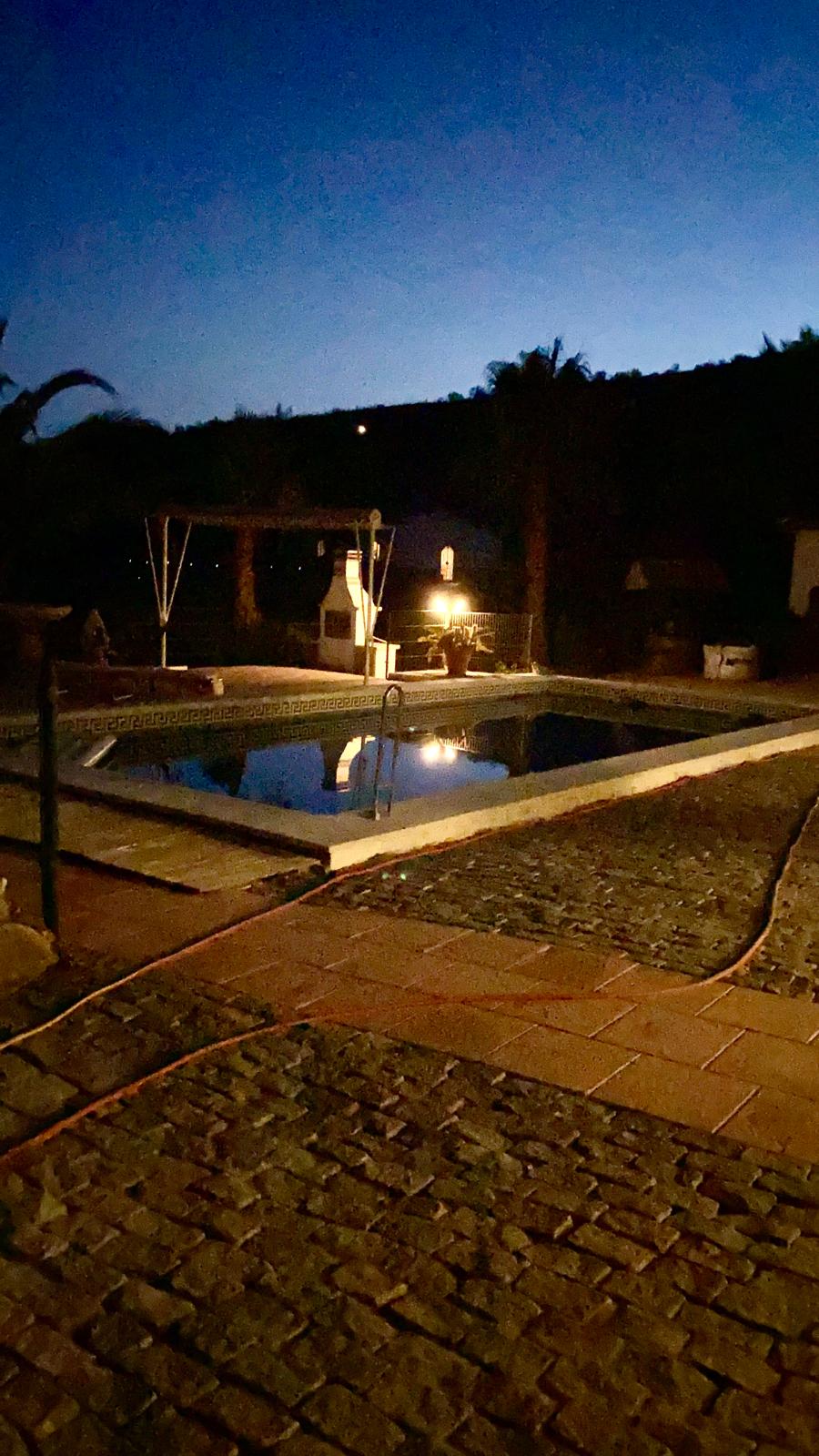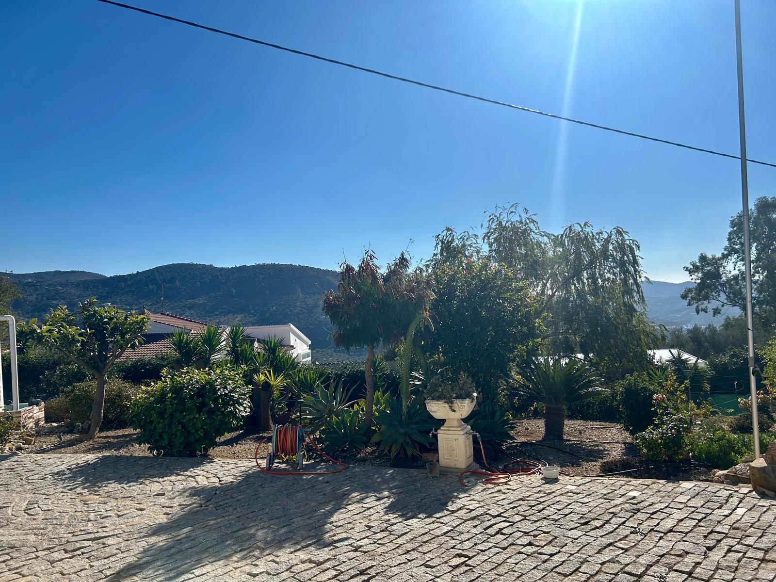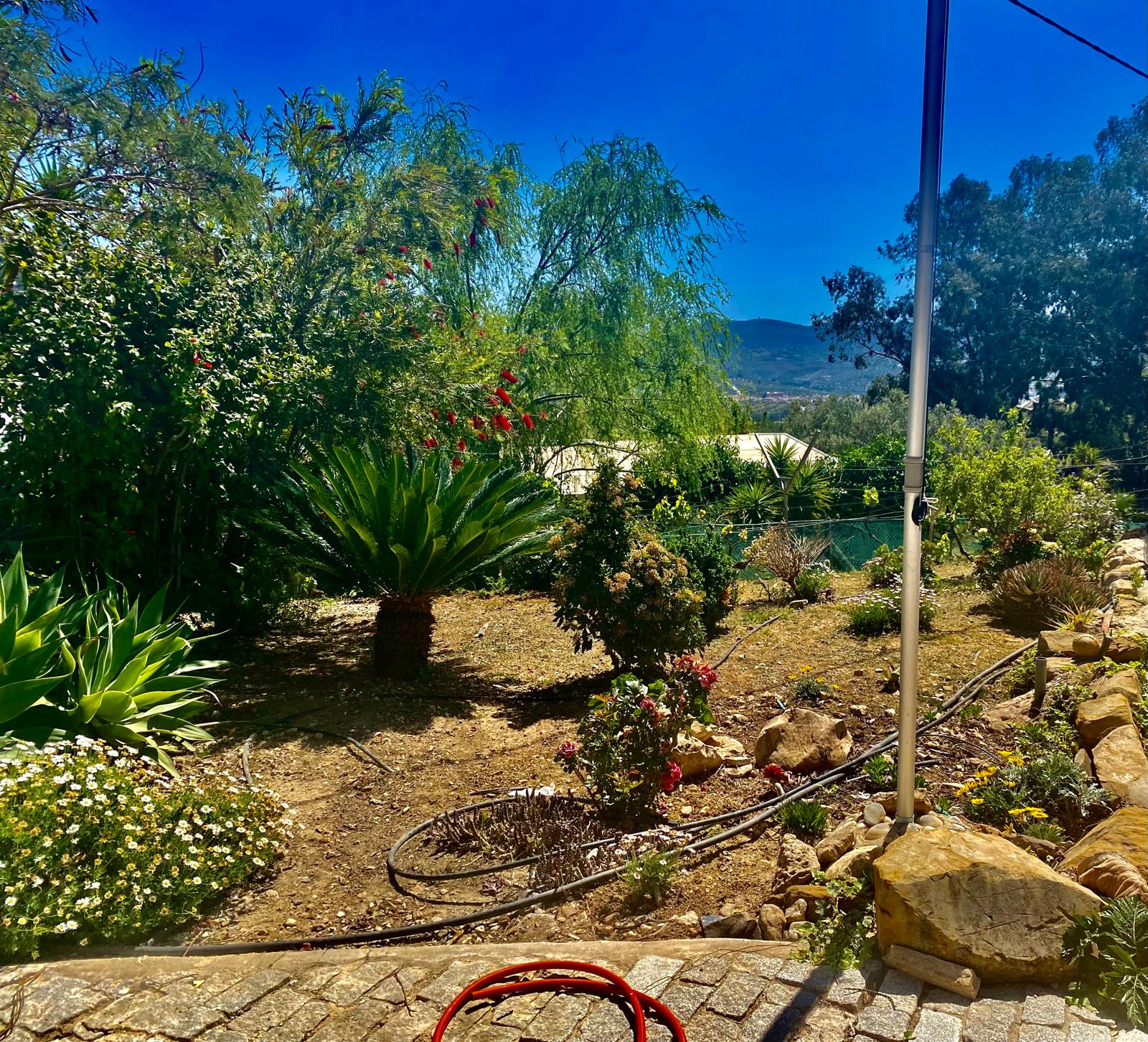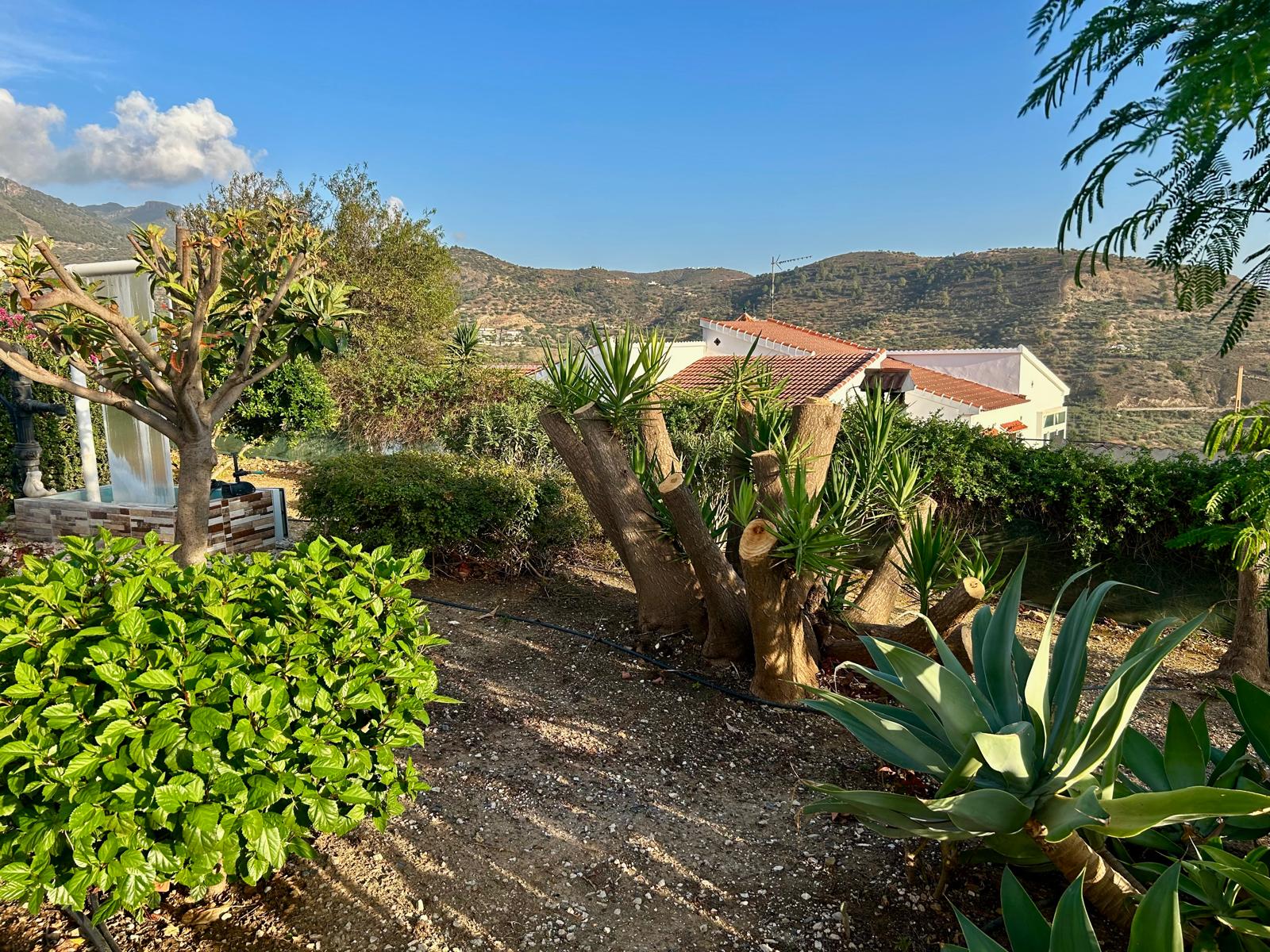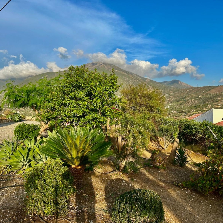 The fully fenced plot includes a wide selection of mature fruit trees—citrus, avocado, fig, níspero, papaya, mango, and vines—supported by an automatic irrigation system. Behind the outbuilding lies an additional orchard/field area. A private well, which has remained dependable even during dry spells, supplies water both to the garden and to the 5 x 10 m swimming pool at the front of the house, where an outdoor shower is also installed.