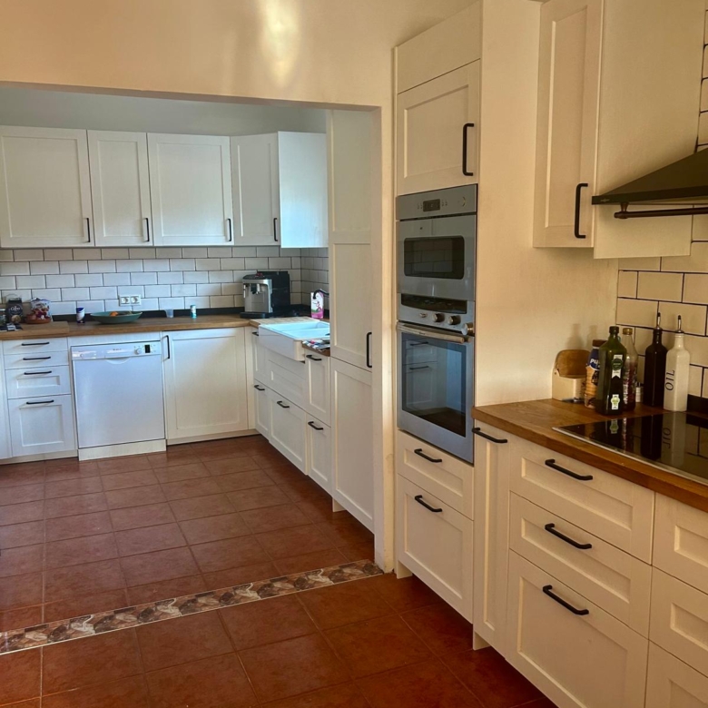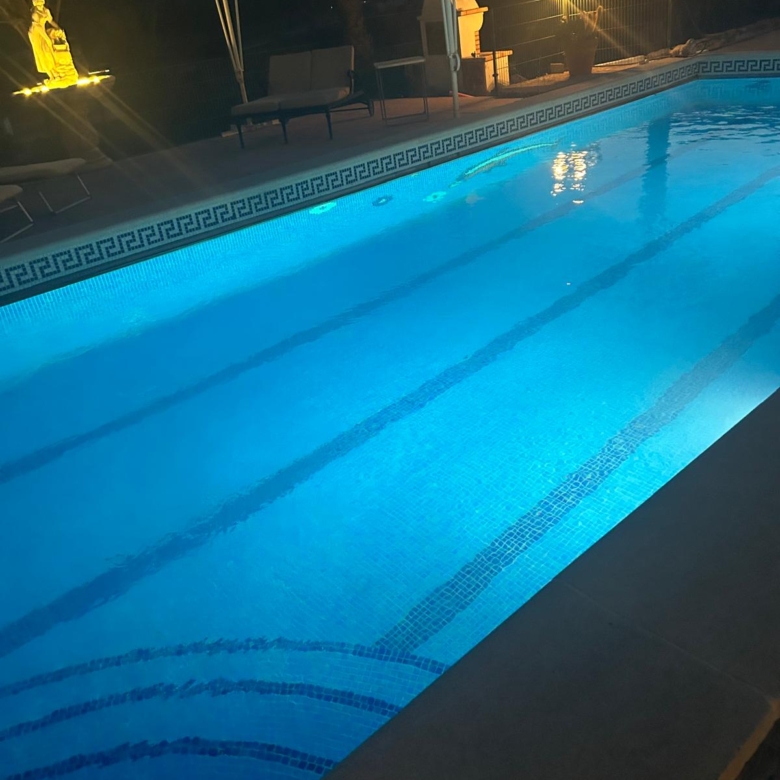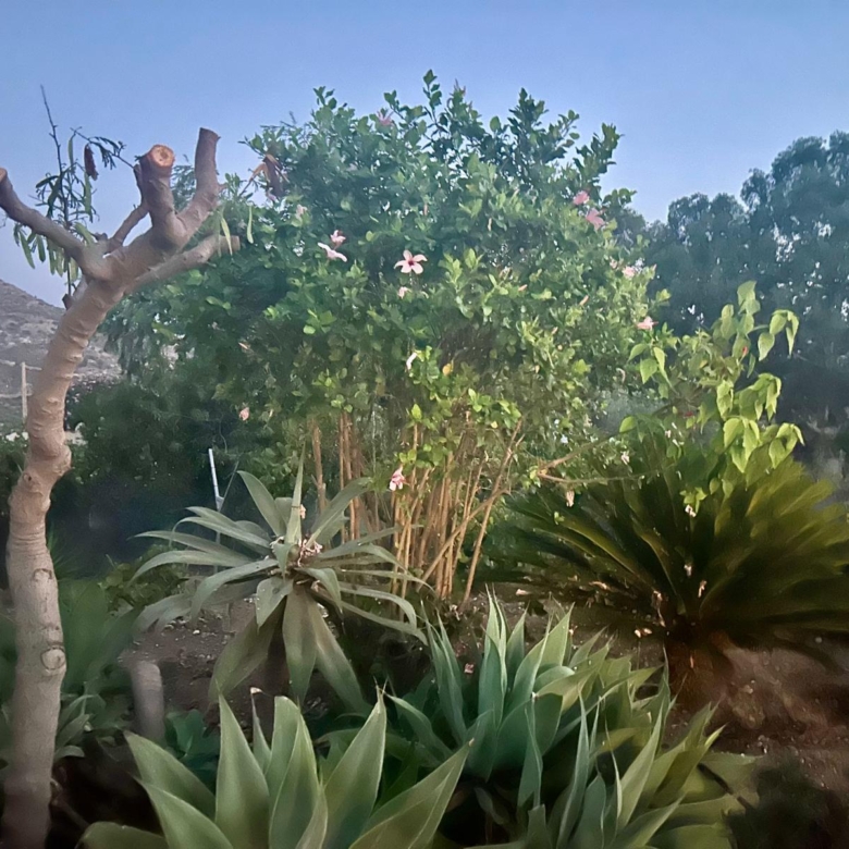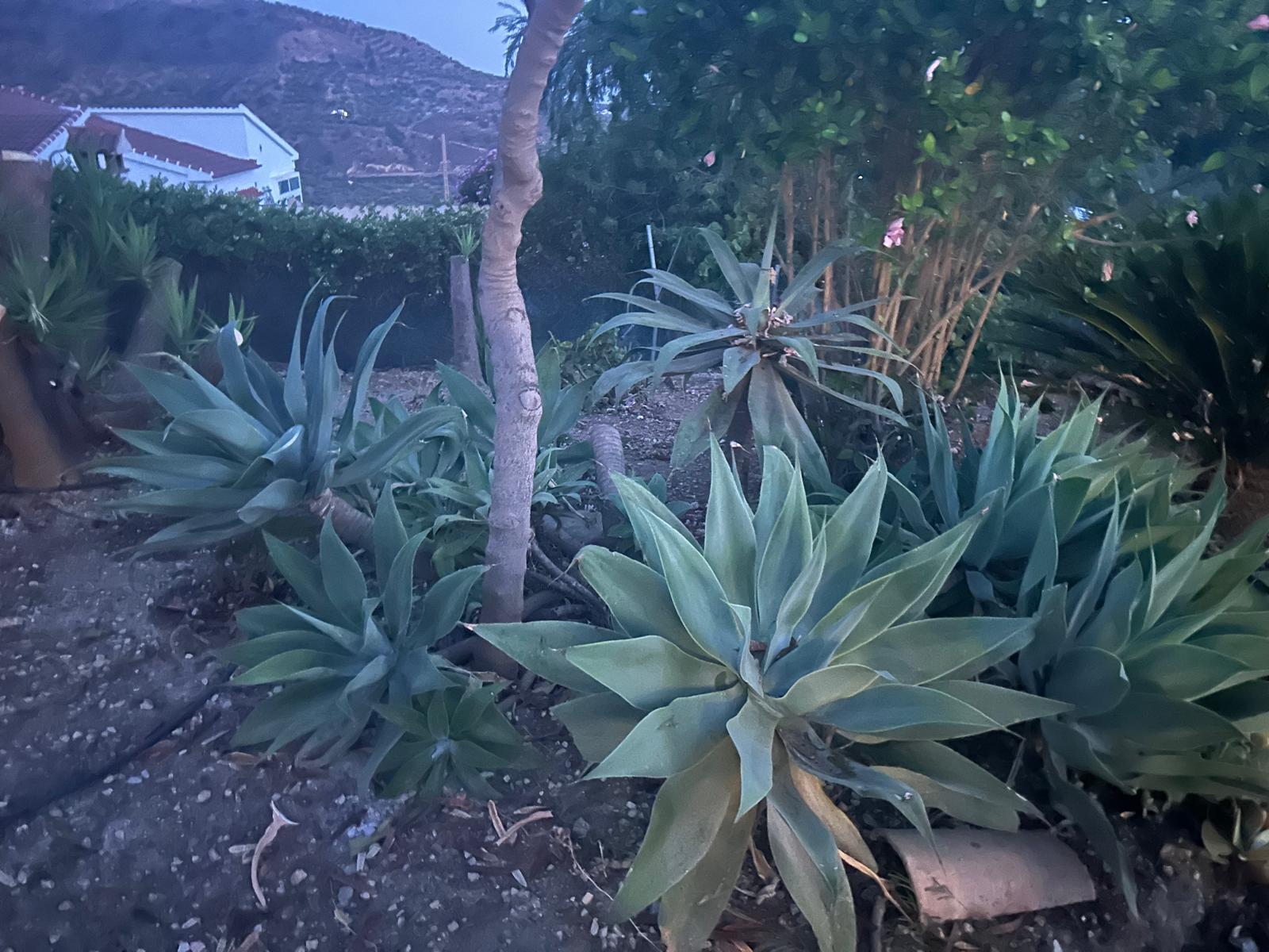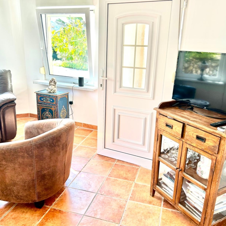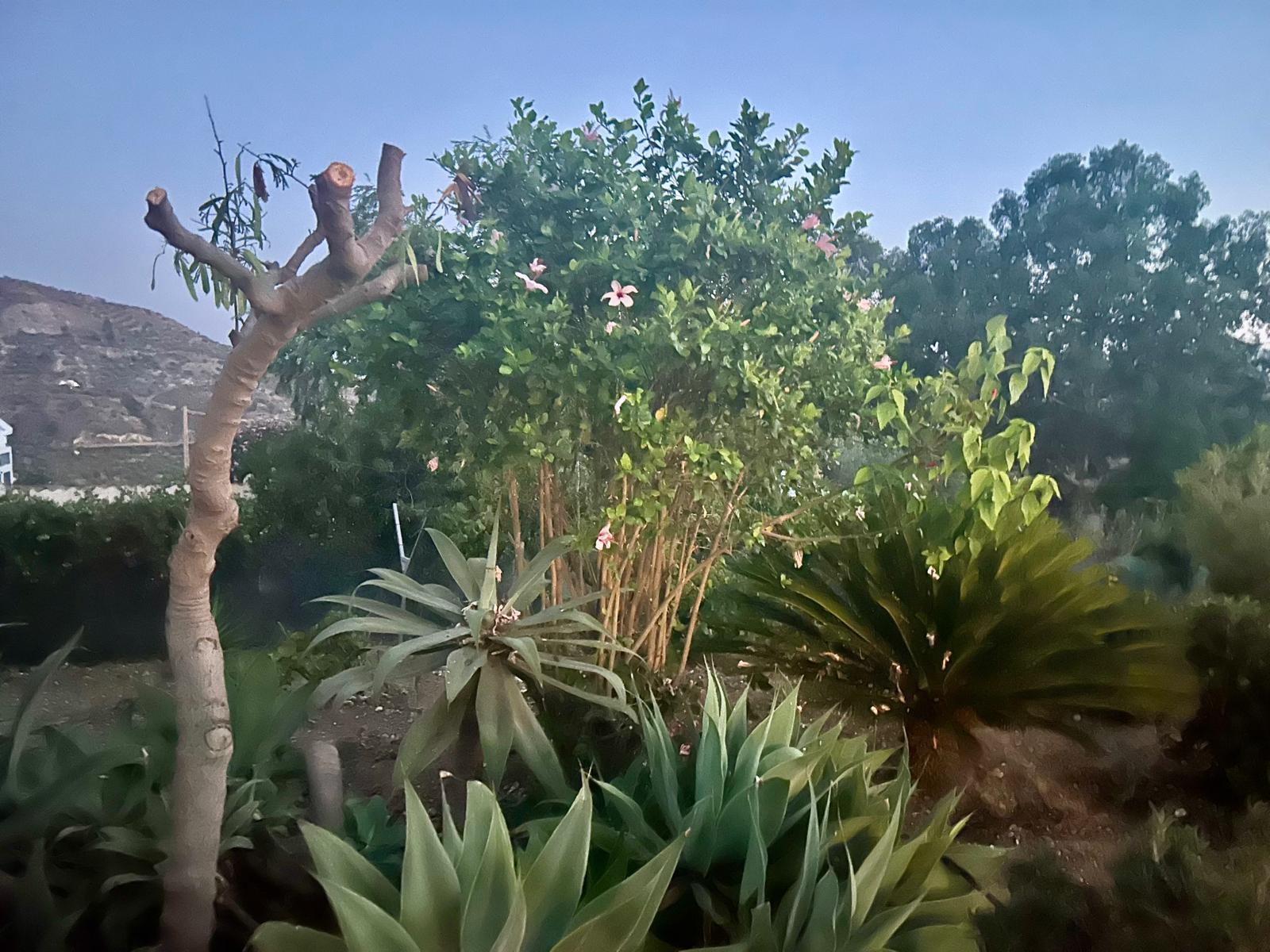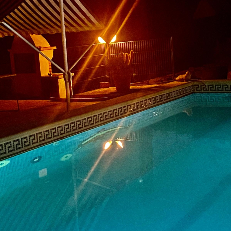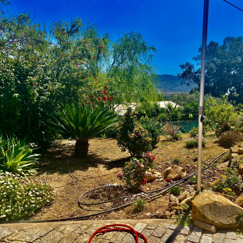 The fully fenced plot includes a wide selection of mature fruit trees—citrus, avocado, fig, níspero, papaya, mango, and vines—supported by an automatic irrigation system. Behind the outbuilding lies an additional orchard/field area. A private well, which has remained dependable even during dry spells, supplies water both to the garden and to the 5 x 10 m swimming pool at the front of the house, where an outdoor shower is also installed.