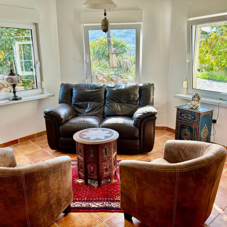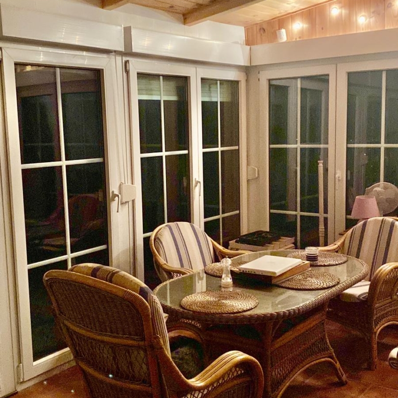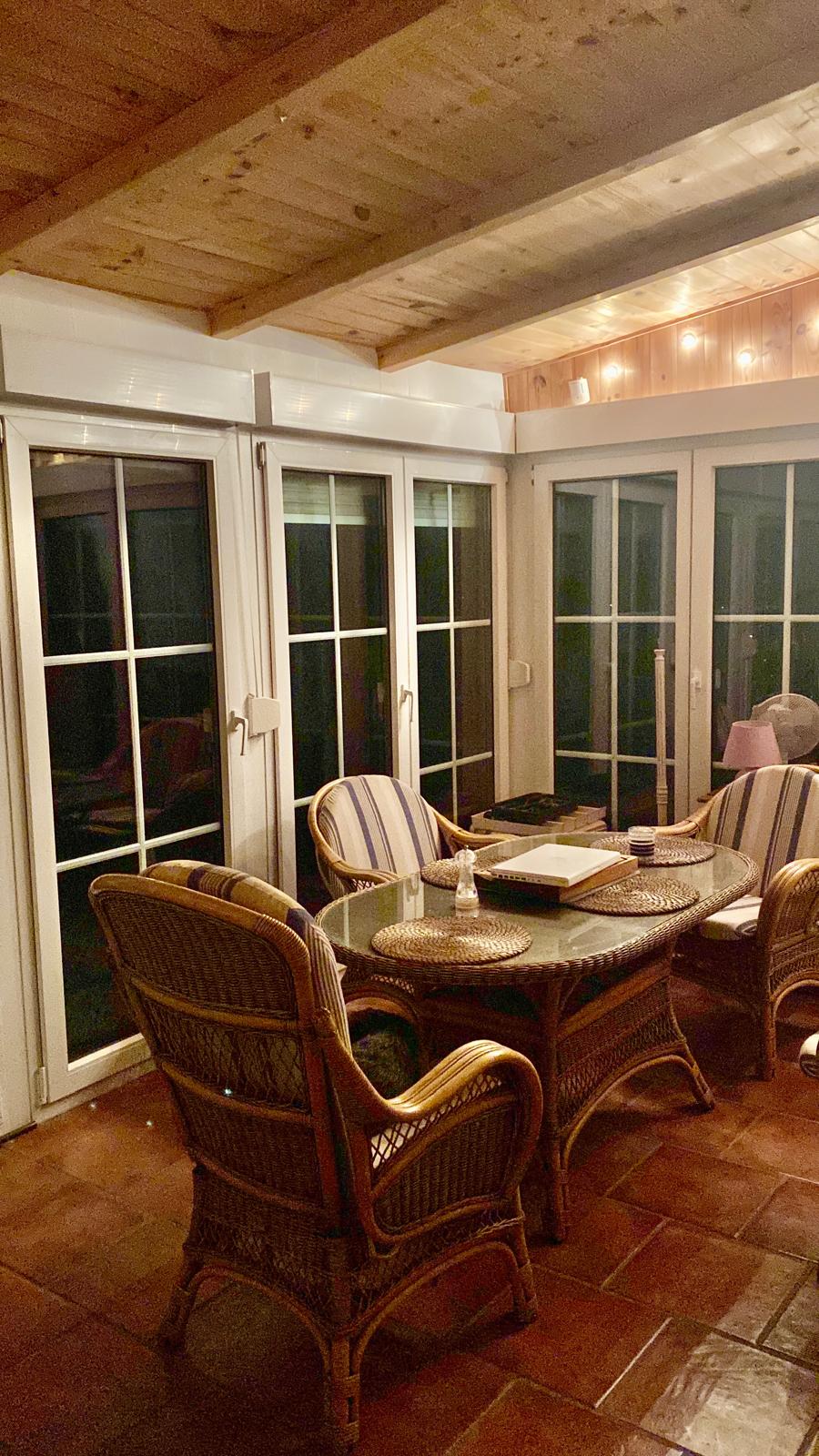From the dining area, a door leads into a bright conservatory with a wooden ceiling and panoramic views of the Maroma landscape. The tilt-and-turn glass doors can be fully opened, creating a seamless indoor–outdoor environment.
