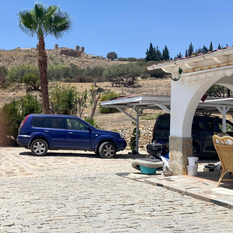 The entrance opens through electric gates onto a circular driveway that allows easy vehicle access around the property, including for motorhomes. A double carport provides covered parking, while a separate outbuilding contains a small garage (suitable for motorbike storage), a 2,000-litre water deposit, and an extra room now used as a workshop and storage space with potential for alternative uses.