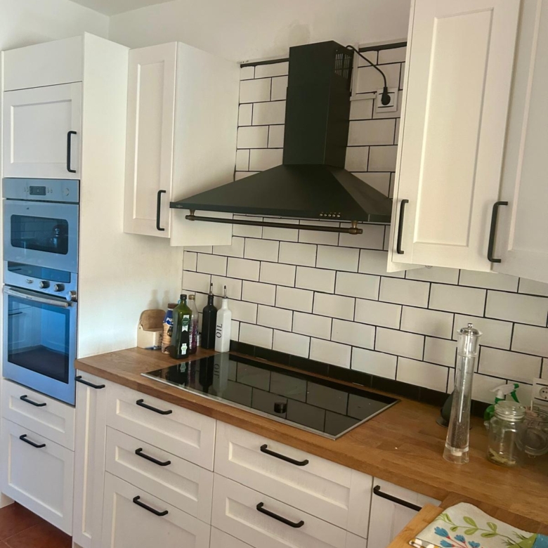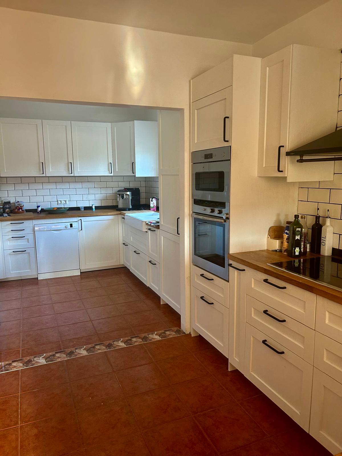• Fully fitted kitchen with wooden countertops, double sink, oven, microwave, hob, dishwasher, and washing machine