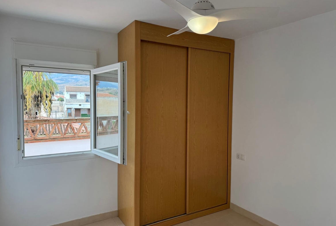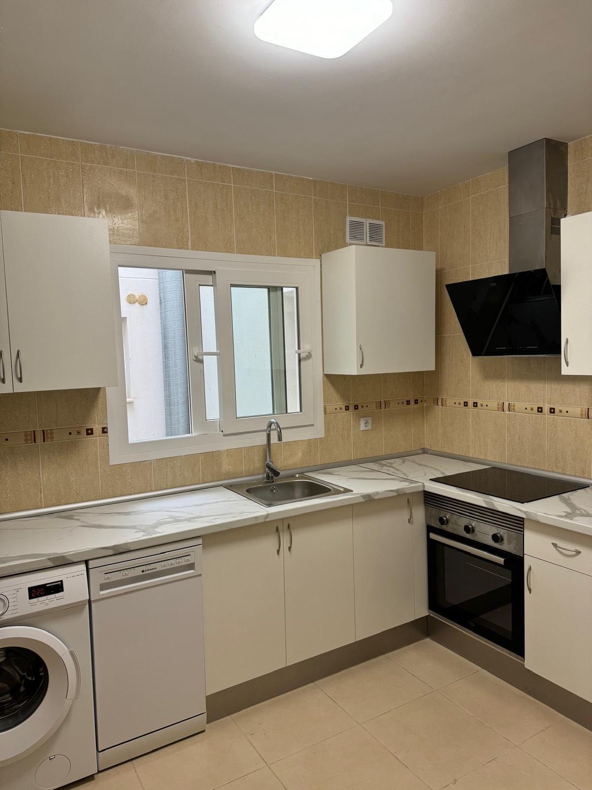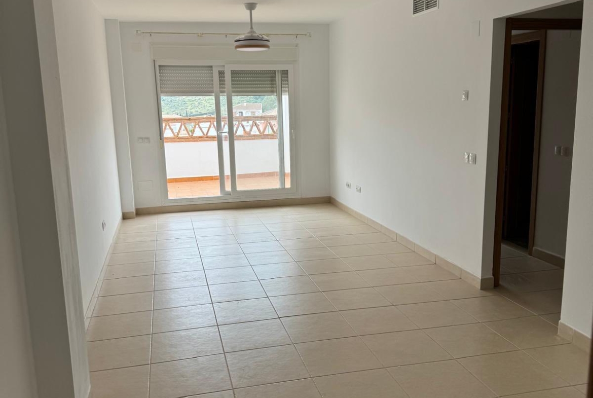 The property consists of a bright living and dining area with patio doors leading to the terrace, a modern fully fitted kitchen, and two bedrooms with built-in wardrobes.